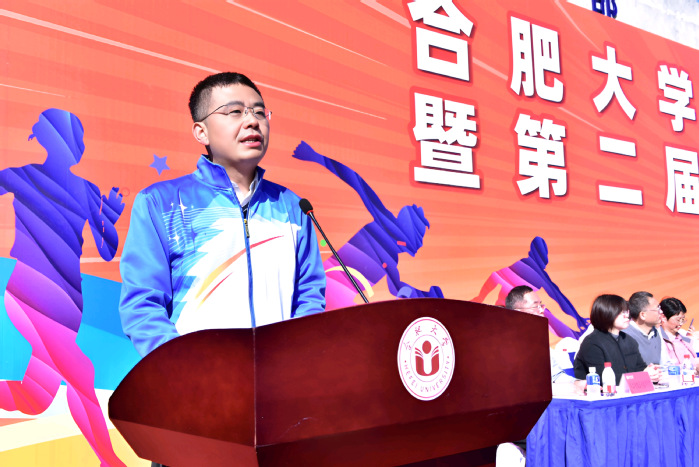 任永致开幕词。他指出,体育是“五育”并举全面发展的关键一环,更是立德树人根本任务的重要载体。学校坚持把体育教育融入人才培养全过程,持续推进体育俱乐部制改革,改革实践两次荣获安徽省教学成果一等奖,学生在国内国际多个体育赛事中不断取得优异成绩,校园内形成了热爱体育、参与运动的浓厚氛围。他希望全体运动员发扬顽强拼博的精神,勇于超越自我,敢于挑战强者,尊重规则、尊重对手,赛出风格、赛出水平;希望全体裁判员恪尽职守,公正裁决,维护赛场的公平与秩序;希望全体师生把赛场上的拼搏精神、团队意识与竞争品格,转化为“实”字当头、“干”字为先的实际行动,为学校的高质量发展注入更强劲的动能。