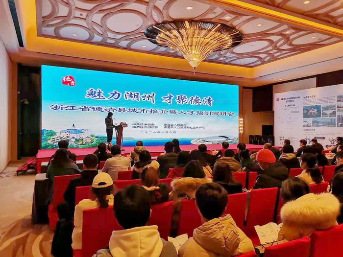 推介会上,黄建丰从历史地理、文化优势、产业优势等方面简要介绍了德清县的基本情况。蒋斌从实习就业、安家落户、创新创业等方面详细介绍了大学生来德清就业创业的政策待遇和发展前景等等。