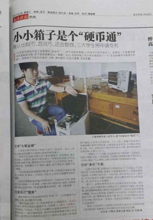 “公交投币箱每天吞上百假硬币、游戏币”……对于这样的新闻,人们似乎已经不陌生了。如果有一个能看出假币的智能投币箱,是不是就能解决这一难题?近日,合肥学院三名大学生就研发了一个“全自动硬币分类清点系统”。该系统不仅能自动鉴别、分类、清点硬币,还轻巧便携、成本低廉。