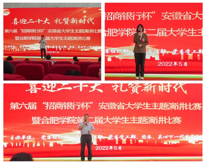 5月26日,合肥学院“喜迎二十大 礼赞新时代”第二届大学生主题演讲比赛在图书馆报告厅举行。比赛由党委组织部、党委宣传部、党委学工部、团委、关心下一代工作委员会联合举办。安徽省演讲学会会长崔跃松、招商银行云谷路支行行长胡婧、教育学院教授鲁世秀、团委副书记李妍妍、党委学工部思政教育中心主任黄锐担任评委。