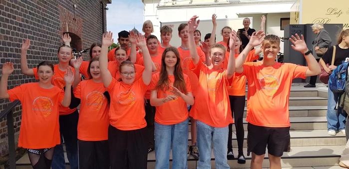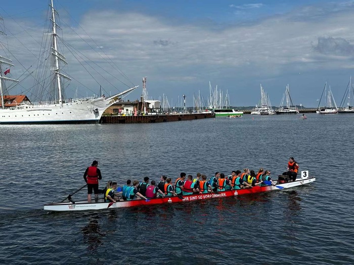 In diesem Jahr stellte das Konfuzius-Institut Stralsund das Drachenbootrennen als eine der zentralen Aktivitäten zum Drachenbootfest in den Mittelpunkt und kooperierte erstmals mit der örtlichen chinesischen Sprachschule Adolf-Diesterweg-Schule. Diese Zusammenarbeit wurde von den lokalen Schulen mit Begeisterung aufgenommen. Rund 450 Schüler aus der Adolf-Diesterweg-Schule sowie sieben anderen Schulen aus Stralsund, insgesamt fast zwanzig Drachenboot-Teams, versammelten sich, um gemeinsam zu konkurrieren. Die Teilnehmer trugen leuchtend bunte Team-Outfits und ruderten im Takt von kräftigen Trommelschlägen mit voller Energie. Sie zeigten einen hohen Teamgeist und eine gute Zusammenarbeit. Das Publikum am Ufer war begeistert und feuerte die Teilnehmer lautstark an, was eine fröhliche und lebhafte Atmosphäre schuf.Im Drachenbootrennen nahm die Adolf-Diesterweg-Schule mit 40 Teilnehmern teil. Die Schüler kamen aus den Jahrgangsstufen 7 bis 10, und die Teams „Rollmops“ und „Banana“, die mit orangefarbenen bzw. grünen Teamtrikots, die mit „Konfuzius-Institut Stralsund“ bedruckt waren, besonders auffielen, zogen die Aufmerksamkeit der Zuschauer auf sich. Ein deutscher Zuschauer äußerte begeistert, dass er nie gedacht hätte, ein so spannendes Drachenbootrennen in Stralsund zu erleben und hoffte, dass künftig mehr solche Veranstaltungen stattfinden würden.
