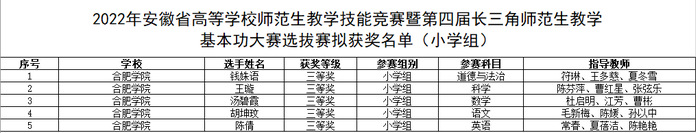 近日,省教育厅公布了2022年安徽省高等学校师范生教学技能竞赛获奖名单,我校教育学院推选的7名学生表现出色,获得一等奖1项、二等奖1项、三等奖5项。